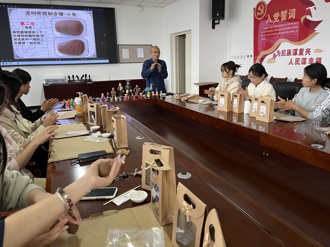 为深入贯彻落实习近平文化思想,彰显信阳优秀传统文化的独特魅力,培养德美艺美的时代青年,10月31日下午,我院在文学艺术楼702会议室开展“巧手捏泥承文韵,匠心传艺谱新章”——淮滨“泥叫吹”非遗文化进校园主题活动。活动由学院团委副书记黄慧慧主持,近70名师生代表参加。