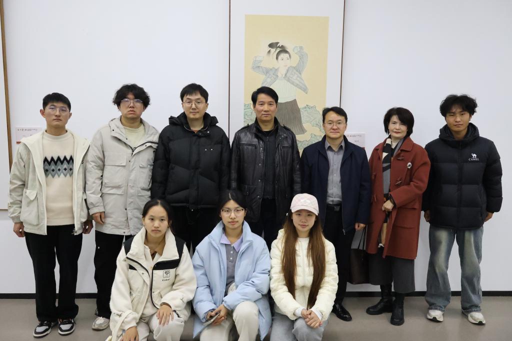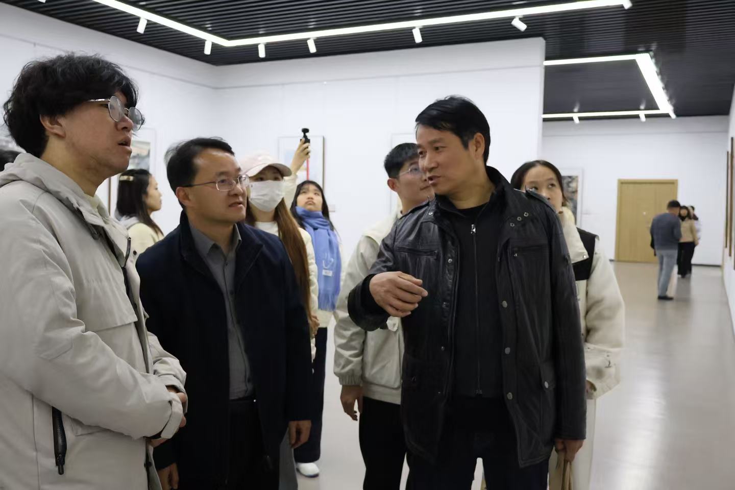 活动在赠书仪式中正式拉开序幕。河南省书画院、信阳市书法家协会等多家单位向包括我院在内的信阳多所高校院系捐赠了书法、美术、摄影等作品集,为学院教学与艺术实践提供了丰富的专业资源。随后,师生们走进展览现场,开展了一堂生动的“行走的美育课”。信阳师范大学美术与艺术设计学院院长邹东升、河南省书画名家李一冉结合展出作品,从创作理念、笔墨技法与文化内涵等方面进行现场讲解。同学们在沉浸式观展与交流中,深刻感受黄河文化的厚重底蕴与书画艺术的时代精神,进一步实现美育熏陶与专业学习的有机融合。