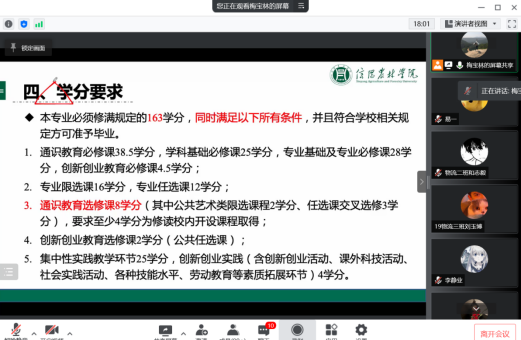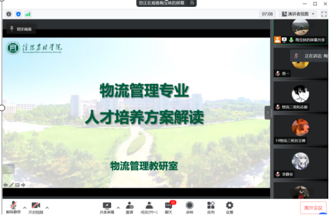 为落实应用型大学的培养目标,立足于以学生为导向的教育教学,充分发挥人才培养方案在人才培养质量提升中的纲领作用,4月7日物流管理专业教研室副主任梅宝林老师通过腾讯会议为本专业2019级和2020级学生进行了2019版物流管理人才培养方案的解读。