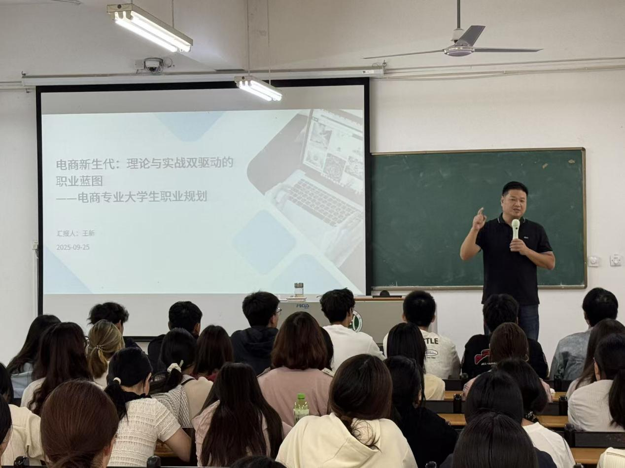 为帮助2025级新生全面了解专业内涵、明确发展方向、科学规划大学学业与职业生涯,电子商务教研室于9月30日在二教109开展了“你好,新电商人暨2025级电子商务专业新生入学教育”活动。本次活动由教研室副主任袁俊老师主持,特邀电商行业资深企业家王懿昕先生为主讲嘉宾,专业骨干教师易善秋副教授、李昊、任仕杰以及2025级全体新生参加了本次活动。