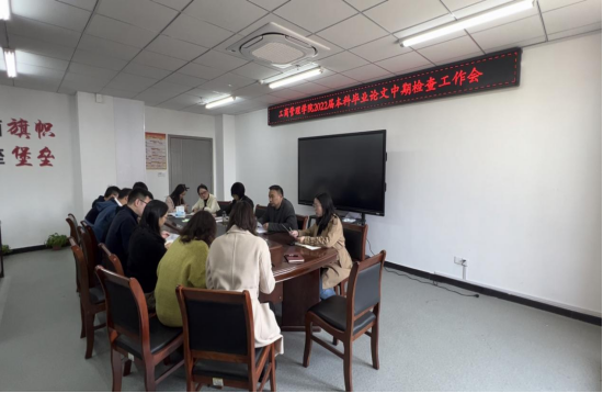 工商管理学院于3月9日下午在双创中心会议室215召开2022届本科毕业生论文中期检查及论文答辩准备工作会议,学院院长潘一平,副院长张世军和全体论文小组组长参会。