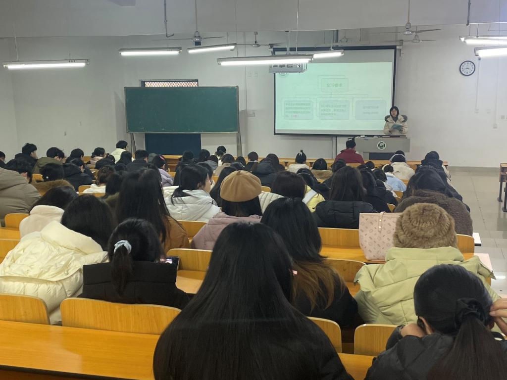 梅宝林首先阐述了毕业实习的重要意义。她指出,实习是人才培养的关键环节,是学生将理论知识转化为实践能力,锤炼专业技能的重要平台。通过实习,学生可以逐步实现从校园到职场的角色转变,培养职业素养,为未来就业与发展奠定坚实基础。随后,梅宝林就实习安排与具体要求作详细说明。她强调,全体同学在实习期间应做到以下几点:端正态度,认真履行岗位职责;主动学习,积极向企业导师请教;勤于总结,按时完成实习周志与总结报告;严守纪律,遵守学校与实习单位规章制度,展现良好精神风貌。最后,梅宝林特别提醒同学们注意实习期间的人身、财产及操作安全,并保持与校内指导教师的常态联系。会议还就实习协议签订、材料提交、考核评定等相关流程作了清晰说明。