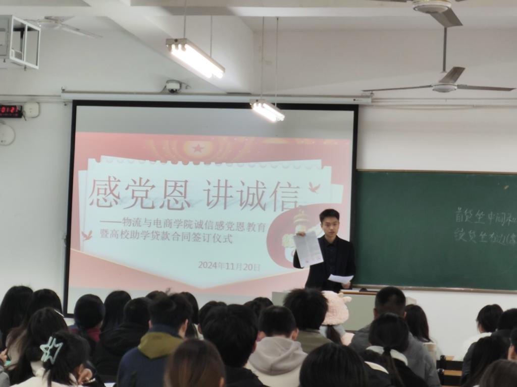 为宣传国家资助政策,增强贷款学生诚信还款意识,完善助学贷款工作流程,11月20日物流与电商学院在二教109召开了2024年高校助学贷款合同签订仪式暨诚信教育大会,学院资助专员姜朝阳、资助服务部及全体高校助学贷款学生参加了会议。
