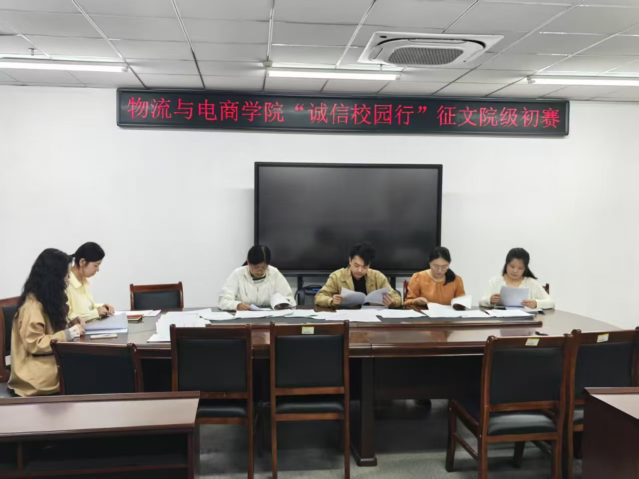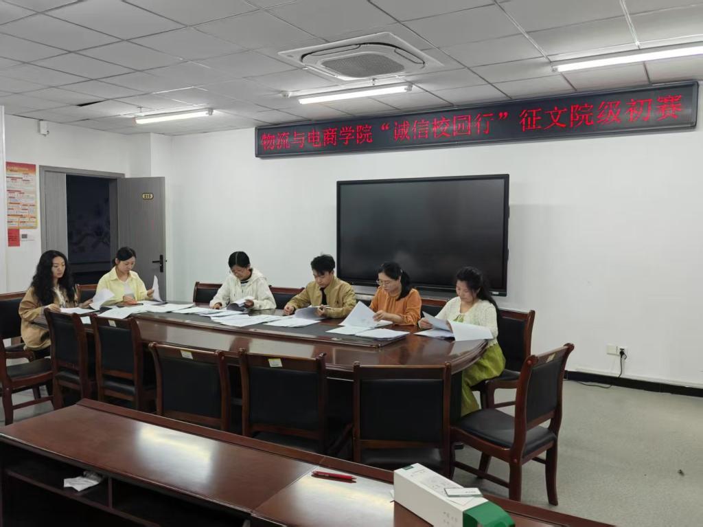为进一步发挥资助育人关键作用,宣传国家学生资助政策及实施成效,4月18日,物流与电商学院在双创中心215组织了“诚信校园行”征文比赛,由学院党委副书记霍玉璨、团委书记赵莹洁、专职组织员李芮宁及部分辅导员任评委。