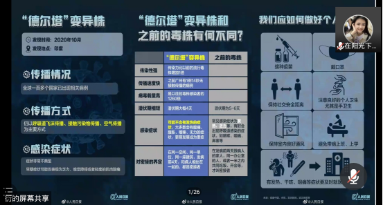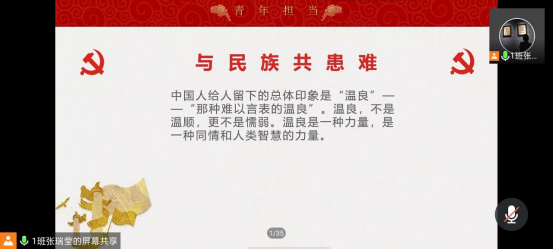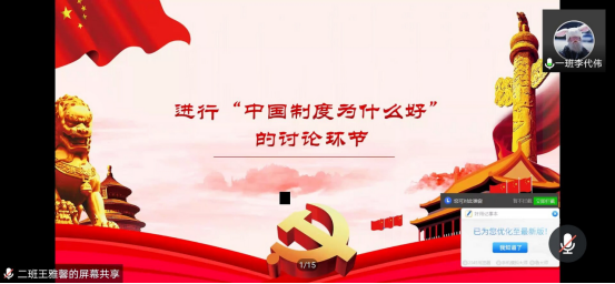 此次线上团日活动采用PPT讲解、视频展播、讲故事等多种形式开展。首先,各班团支书介绍此次团日活动主题,全班同学合唱国歌、团歌以及进行宣誓等一系列活动后,各班团支书向同学们讲述疫情、汛情期间的感人故事,将疫情、灾难变为一本生动的“活教材”,引导学生把灾难当教材、把困难当磨砺。随后,辅导员老师发言,在表达对学生关怀的同时,并帮助学生正视灾情和疫情。用救灾抗疫的鲜活案例,引导广大学子众志成城,在灾难面前,不忘使命,凝聚个人责任和担当,把灾难当做教材,用抗洪和抗疫精神鼓舞每个学生。对于班级中涌现出来的抗洪抗疫典型,辅导员老师着重进行了表扬,并鼓励其他同学,在确保自身安全的前提下,积极响应当地党团组织的号召,为抗洪抗疫奉献力量。最后,各班涌现的抗洪抗疫志愿者代表发言,同学们围绕主题进行线上讨论,纷纷表示,要以实际行动为抗击疫情贡献力量,用自己的方式发光发热。