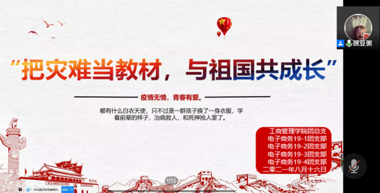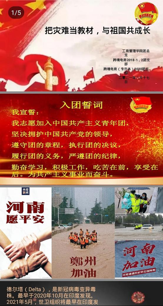 为引导青年团员肩负起新时代的使命和义务,把困难当磨砺,把灾难当教材,与祖国共成长,鼓励青年学子以实际行动抗击汛情、疫情,工商管理学院8月16日—20日组织各团支部开展了“把灾难当教材,与祖国共成长”线上主题团日活动。