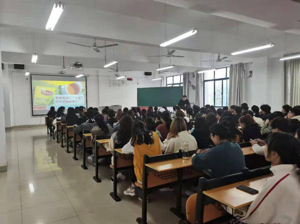 讲座期间,余教授以信阳毛尖作为切入点,深刻剖析了如今的茶叶市场现状,同时以立顿公司的发展为案例,融入现代营销理念,为学生讲解如何开发新产品、注重品牌营销以及满足消费者需求等,深入浅出地为同学们讲解原本枯燥的营销理论知识。余老师幽默而深刻的谈吐间流露着一个营销人的热情也以话语为媒介将这种热情传递给更多的营销学生。