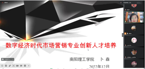 为积极探索先进教育理念与专业教育实践有效融合,优化创新人才培养模式,实现人才培养质量的稳步提升。2022年12月14日,工商管理学院邀请南阳理工学院卜森教授做了一场“数字经济时代市场营销专业创新人才培养”的线上学术报告,我院全体师生参与此次报告,会议由市场营销教研室主任郭昭君主持。