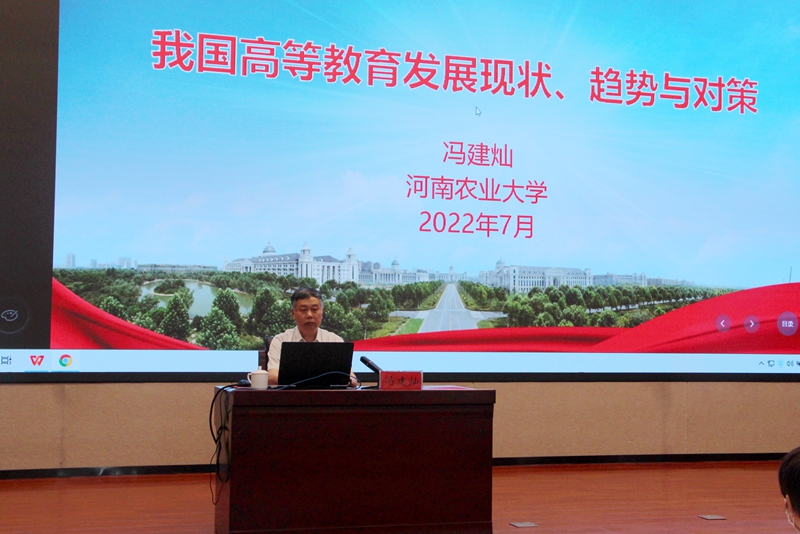 开班仪式结束后,二级教授、博士生导师、河南农业大学教务处处长冯建灿教授以《我国高等教育发展现状、趋势与对策》为题作了本期培训的第一课,重点介绍了我国高等教育的现状,分析了目前存在的主要问题,展望了下一步的发展趋势,提出了具有针对性的对策与建议。