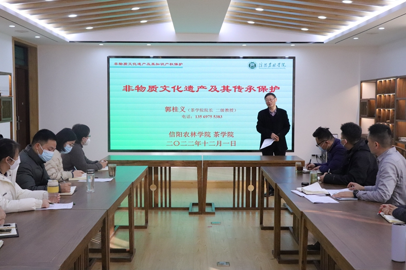 茶学院党总支书记、院长郭桂义以“非物质文化遗产及其传承保护”为题对茶学院全体教师进行培训,并对学院非遗保护传承工作进行总结。郭桂义指出,习近平总书记高度重视非遗保护工作,作出一系列重大决策部署,推动非遗保护事业进入系统性保护新阶段。中国传统制茶技艺及其相关习俗体现了中国人所秉持的谦、和、礼、敬的价值观,并通过丝绸之路促进了世界文明交流互鉴。