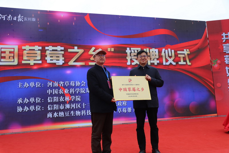 信阳市浉河区十三里桥乡草莓产业园被河南省草莓协会评为“河南省百县草莓标准示范园”,浉河区十三里桥乡荣获“中国草莓之乡”的称号。十三里桥乡草莓产业园荣获“河南省百县草莓标准示范园”,浉河区荣获“中国草莓之乡”。随后,与会领导为精品草莓擂台赛和园艺文化节活动中金银奖获得者颁发了荣誉证书。