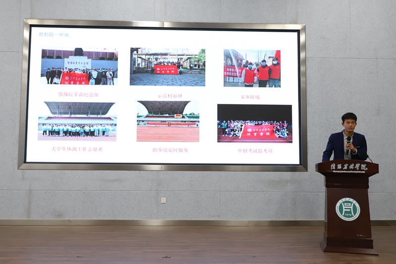 宣讲会上,22名最美大学生候选人分别从个人事迹出发,结合成长经历,谈理想、话奋斗、讲担当,讲述了他们在学习、工作、生活中的所思所悟。有为国防事业携笔从戎的爱国情、报国志;有面对疫情为同学、为家乡亲人的健康平安奋不顾身、勇往直前的志愿服务故事;有立足专业实践投身乡村振兴的科研励志典型,他们个个成绩优异,甘于奉献、积极投身社会实践,集中体现了信农学子的自信自强、积极昂扬向上的精神面貌,尽显新时代大学生的青春风采。