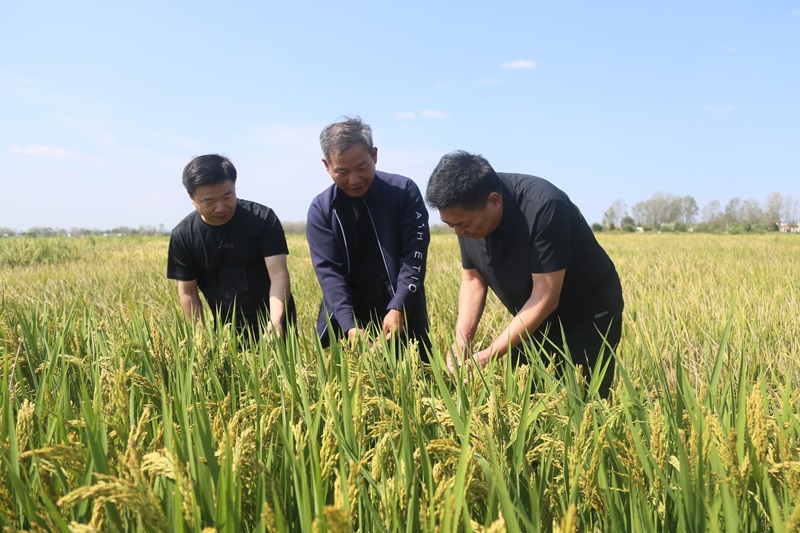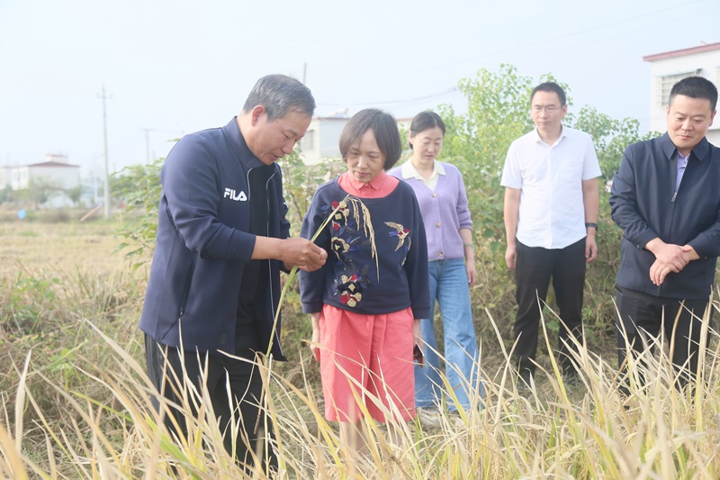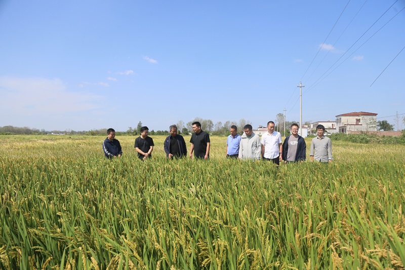黄松、曹健一行实地考察了位于平桥区甘岸镇二郎村的水稻基地,详细听取了水稻科研团队带头人鲁伟林研究员关于水稻科研基地建设、品种选育及配套技术集成、项目实施、成果转化等情况的汇报。黄松、曹健深入田间地头,实地查看了科研团队培育的水稻新品种生长情况,与团队教师季新、刘秋员、刘娟等面对面交流,详细了解新品种的性状表现。