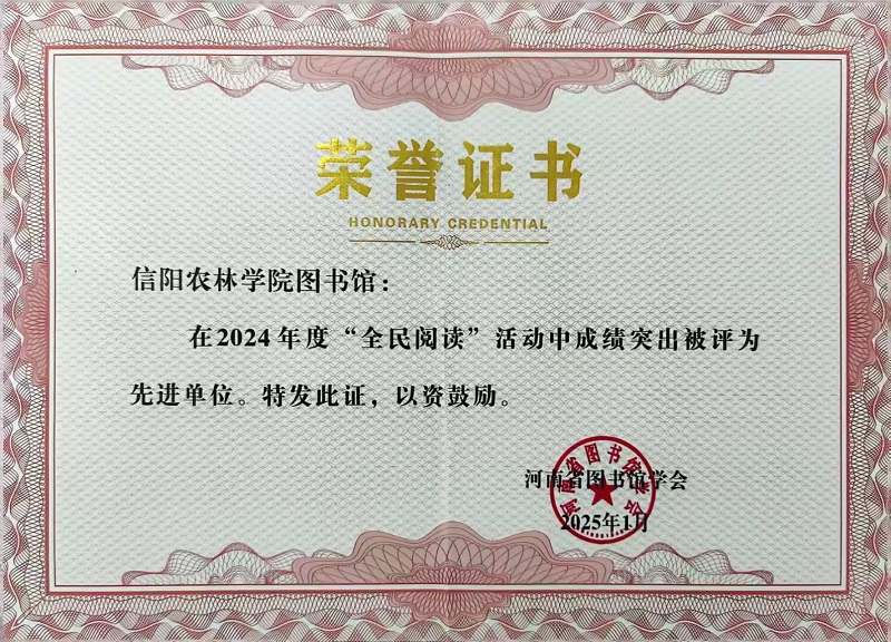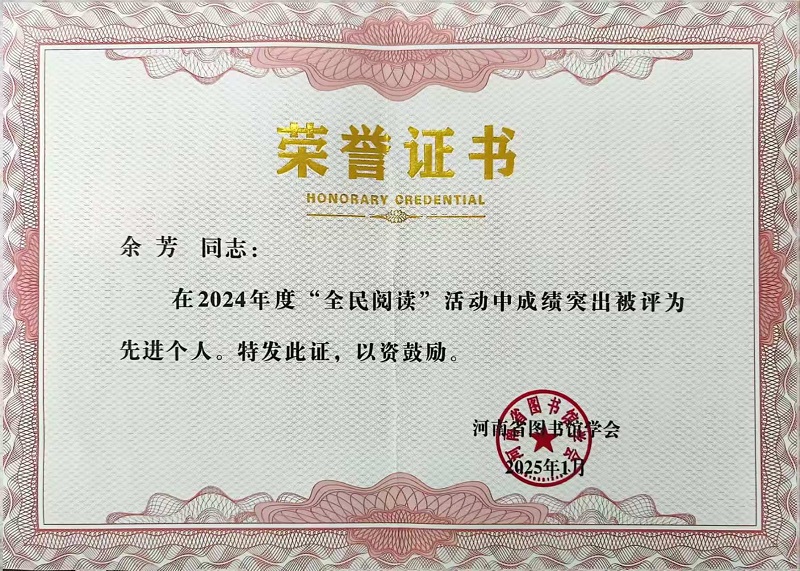 近日,河南省图书馆学会对全省各级各类图书馆在2024年开展全民阅读活动中取得显著成绩的单位和个人进行表彰,beat365在线平台官网图书馆被评为2024年度“全民阅读”先进单位,余芳老师获评“全民阅读”先进个人。