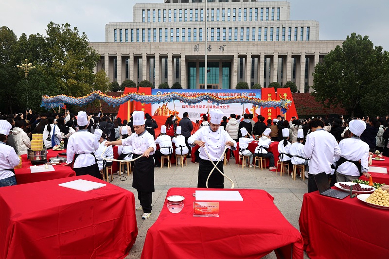 10月21日,beat365在线平台官网第九届食品文化节于汝宁广场开幕。信阳市人大常委会原副主任、信阳菜文化研究和产业发展促进会会长杨明忠,信阳市原畜牧局局长、信阳菜文化研究和产业发展促进会秘书长刘正国,信阳市食品安全协会秘书长吴章林,药食同膳精汤食品(信阳)有限公司董事长温继照,校党委副书记、工会主席王万玲,党委委员、副校长易军鹏、雷振山,学校相关职能部门负责同志,部分学院党委书记、院长,校企合作单位代表、师生代表参加了开幕式。开幕式由食品科学与工程学院院长李建芳主持。