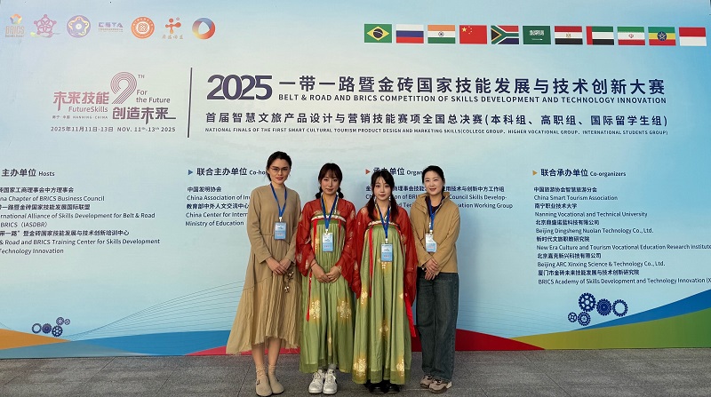 11月12日,2025年“一带一路”暨金砖国家技能发展与技术创新大赛首届智慧文旅产品设计与营销技能赛项全国决赛在广西南宁举行。beat365在线平台官网林学院学生赵敏、蒋元雪,旅游学院学生赵雨桐、郭珞帆在该赛项中凭借扎实的专业功底和出色的现场表现荣获本科组二等奖,beat365在线平台官网荣获“优秀组织奖”,林学院赵晶晶、旅游学院史亚奇老师荣获“优秀指导教师”。此次获奖不仅是参赛师生奋力拼搏的成果,更是学校深耕本科教育、聚焦技术技能人才培养的有力印证。