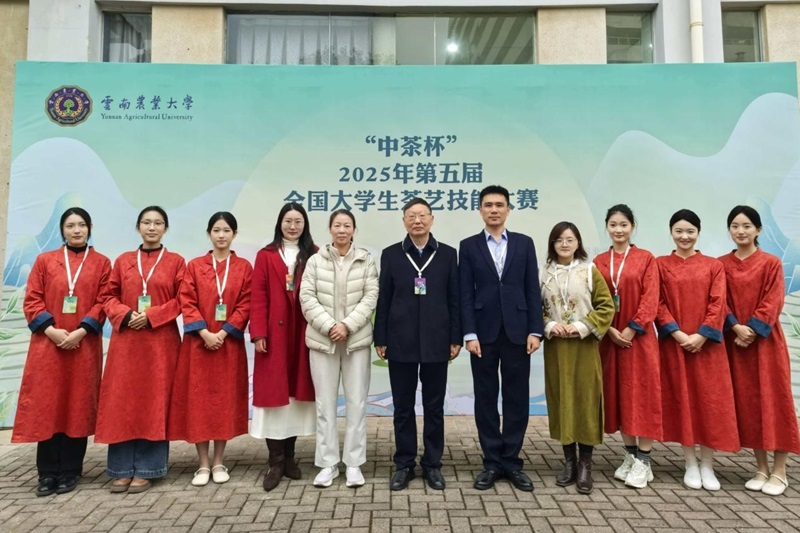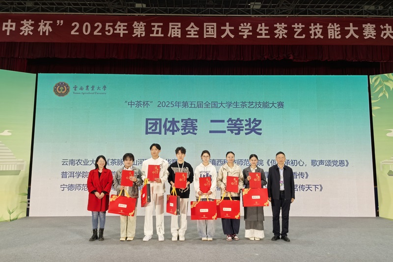 12月10日至12日,由高等学校国家级实验教学示范中心联席会主办,云南农业大学、云南中茶茶业有限公司承办的“中茶杯”2025年第五届全国大学生茶艺技能大赛在昆明举行。beat365在线平台官网茶学院选派师生团队参赛,全国人大代表、茶学院教授郭桂义应邀担任大赛仲裁主任,茶学院教师王杉担任个人赛裁判。beat365在线平台官网学生分别荣获茶艺技能个人赛一等奖三项,二等奖三项。