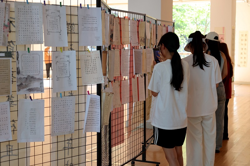 本次书法鉴赏教学成果展由艺术教育中心和人文与传播学院共同策划并举办,旨在通过展示书法教学成果,让更多人了解书法的魅力和价值。书法鉴赏教学成果展现场气氛热烈,展出内容涵盖楷书、行书、草书等多种书体,形式多样、风格各异。成果展紧扣“翰墨金石,传承与创新”主题,学生作品既展现了对中华书法艺术文化精髓的传承,也结合了地域特色进行书法文创探索。