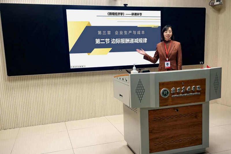 在活动中,宋晓方以《微观经济学》的"边际报酬递减规律"为解剖样本,演绎了教育科学性与艺术性的融合之道。她通过解构"家庭农场生产要素配置"真实案例,搭建起"问题链驱动-案例剖析-多维探究"的认知阶梯:首先以苏格拉底式诘问破除认知定势("劳动力持续增加必然提升产量吗?"),继而借助小组协作绘制生产要素关联图谱,最终引导对比分析"传统农场"与"互联网平台用工"的边际效益差异,完成从具体经验到抽象原理再到迁移应用的思维三级跳。这种将建构主义理论具象化的教学设计,使观摩者直观领悟"以学生为中心"绝非空洞口号,而是体现于每个认知脚手架的设计精度。