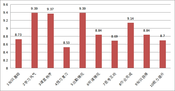 其中,第2项(学习风气)、第5项(出勤情况)、第3项(课堂秩序)的得分分别较高,显示学生课堂出勤情况较好,多数学生尊敬师长、举止文明,课堂秩序好。第4项(预习复习)得分率最低,学生课前预习及课后复习的行为发生率较低。