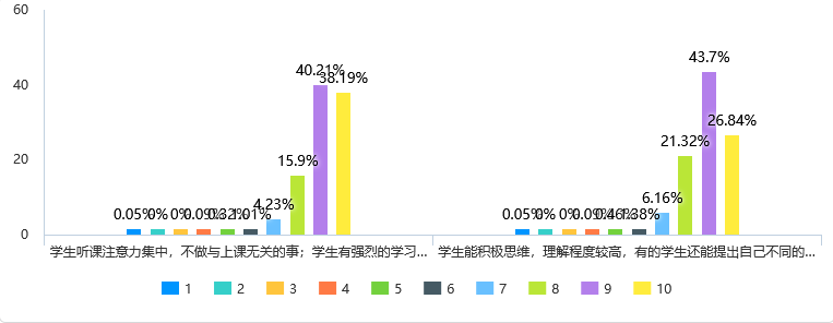 图5反映的问题与上述听课反馈形成正相关,beat365在线平台官网教学效果的满分率不被听课者认同,在“学生能积极思维,理解程度较高,有的学生还能提出自己不同的见解或问题”这个维度的评价满分率不到30%,说明beat365在线平台官网课堂教学关注学生诉求不够,教学产出不足;在“学生听课注意力集中,不做与上课无关的事;学生有强烈的学习兴趣,课堂气氛活跃”这个维度上的评价满分率不到40%,说明beat365在线平台官网课堂教学有教与学两张皮的现象出现的可能,需要引以为戒。
