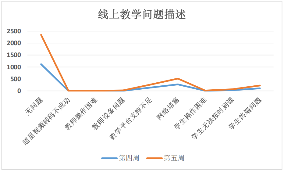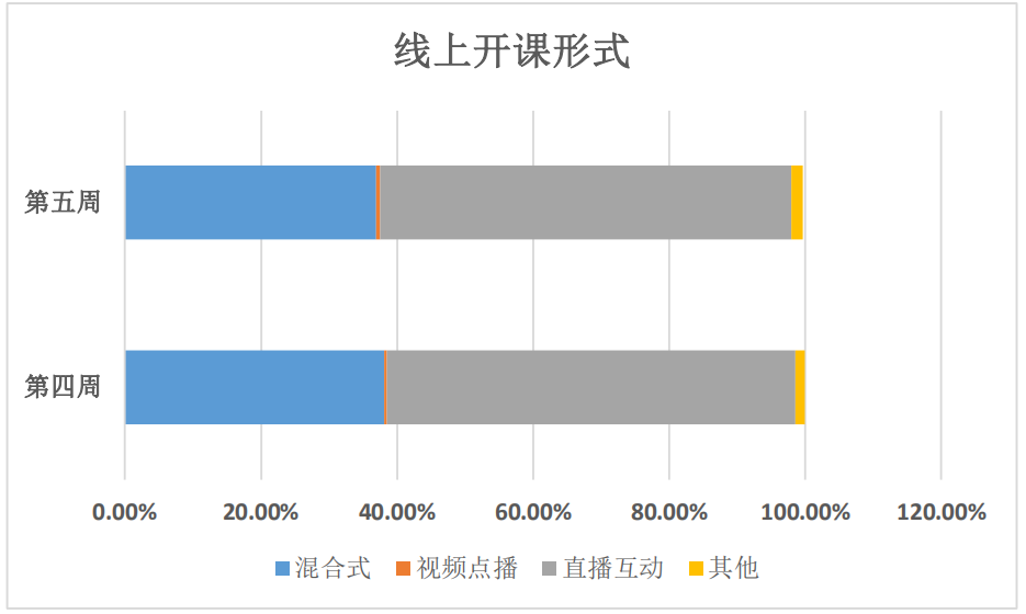 就第四周和第五周数据显示,线上授课呈现“两多一少”的特点,即实际开课门次数增加,教师满意率增加,更换平台课程减少,说明平台运行更加稳定,老师们对平台的使用更加熟悉,线上教学运行日趋平稳。