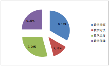 梳理教学督导反馈的问题,可分类为四类问题,分别是教学资源(8 项)、教学方法(3 项)、教学运行(7 项)、教 学保障(6 项)(图 1)