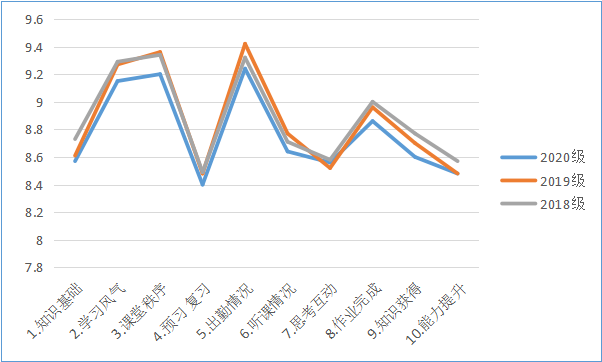 与上学期对比,2019级学生在整体表现上有较大提高,尤其在第5项出勤情况、第6项听课情况赶超了其它年级的学生;2018级的学生整体变化不大,两个学期的表现基本一致;2020级新生在课堂表现上有所下降,新生已经融入大学生活,高中的学习紧张感逐步消退。