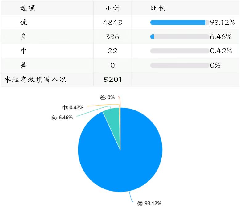 93.12%的学生信息员认同学校的课堂教学效果,课堂教学效果的差评率为零。(详见下图表)