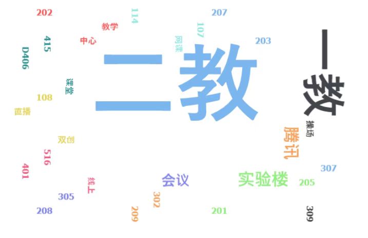 词频分析看出,学校当前教学楼使用频率最高的是二号教学楼,实验室上课和在线教学也成为了常态教学方式或者上课场所。