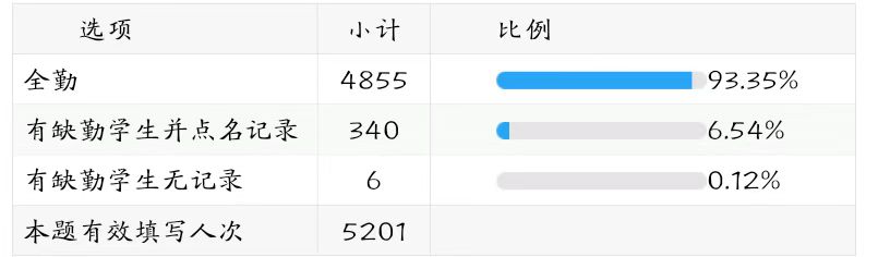 93.35%的课堂教学信息反馈看出,本学期的课堂教学秩序良好,老师坚持对学生进行考勤,对课堂的管控到位,只有少量的课堂教学中出现了“有缺勤学生无记录”的现象(占比0.12%)。(详见下图表)