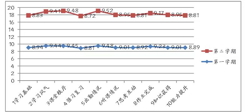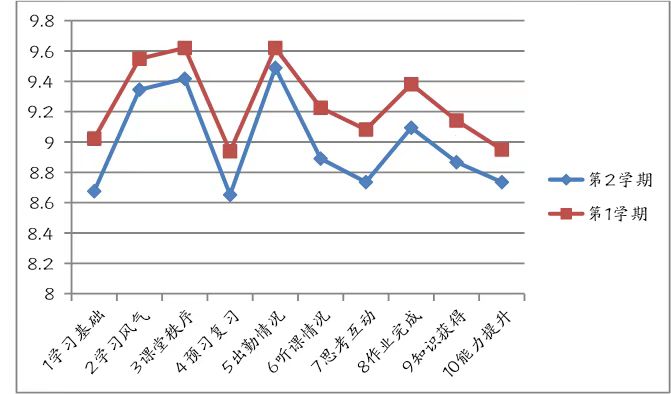 通过图中可以看出,2021-2022学年第2学期的第3项课堂秩序、第5项出勤情况高于上一学期,其余各项均低于上一学期。