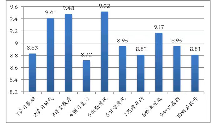 通过图中可以看出,2021-2022学年第二学期的课堂出勤、课堂秩序、学习风气得分最高,这三项与以往数据最高项保持一致,说明学生整体学习气氛浓厚,学风保持较好,多数学生尊敬师长、文明礼仪,课堂秩序好。第4项课前预习与课后复习得分率最低,与以往数据的最低项一致,但是比上一学期有所下降,请注意此项需要继续加强。