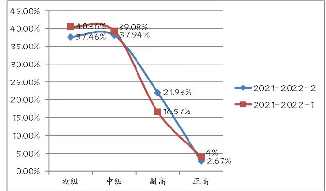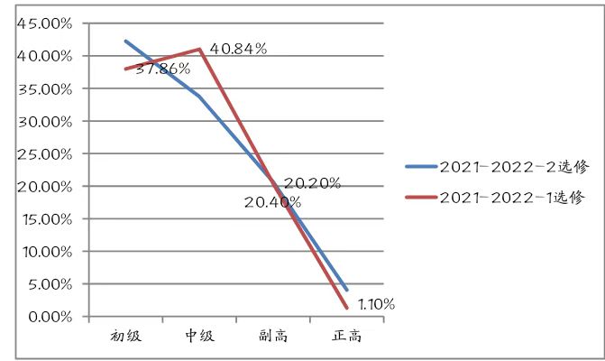 6可以看出,副高职称人员任教必修课的比例较上一学期有所提升。图7可以看出,初级职称人员和正高职称人员任教选修课的比例较上一学期有所提升,副高职称人员任教选修课的比例数据相对平稳。