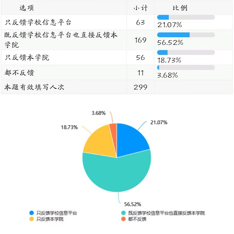 52.52%的学生教学信息员将课堂信息既反馈给学校信息平台也直接反馈到了本学院,课堂教学信息反馈的渠道实现了扁平化,传播效率得到提升。(详见下图表)