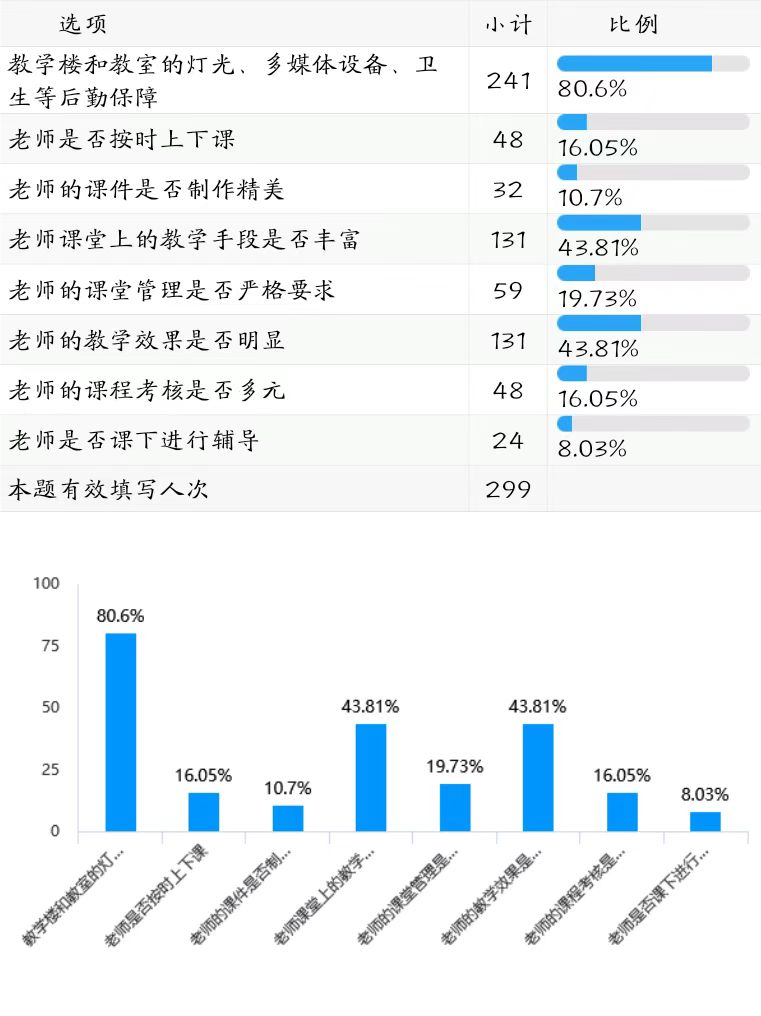 从299名受访者的反馈来看,学生教学信息员最关注的三个方面依次是“教学楼和教室的灯光、多媒体设备、卫生等后勤保障”占比80.6%,“老师课堂上的教学手段是否丰富”“老师的教学效果是否明显”占比均为43.81%,同学们及关注教学后勤保障,也关注教学手段和教学效果。(详见下图表)