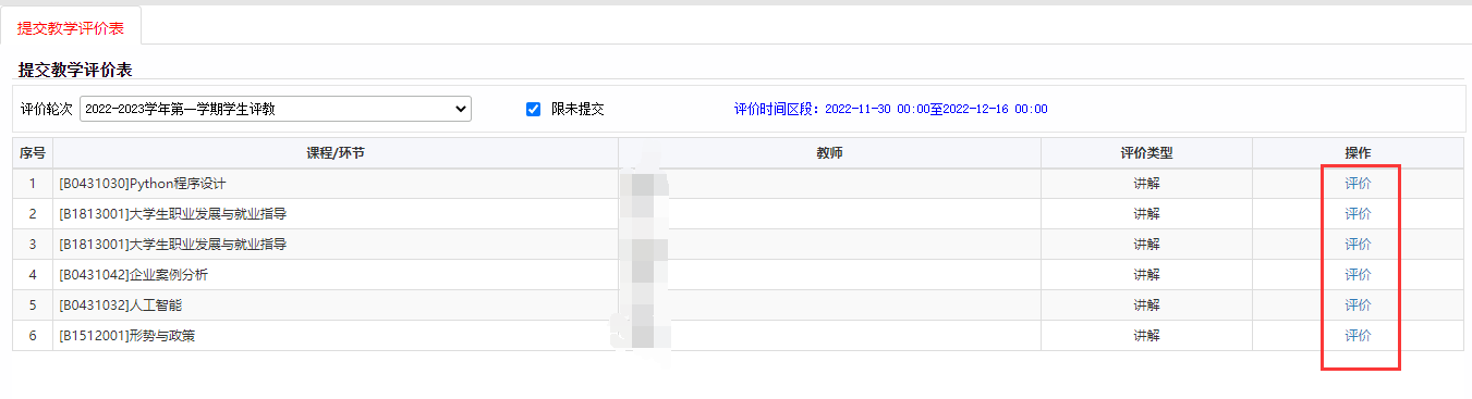 2022-2023学年第一学期学生评教工作于2022年12月6日-2022年12月15日24:00期间进行,请各学院安排学生按照如下流程进行操作。