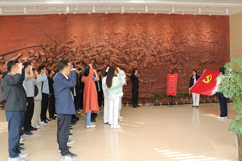 上午,党员教师们来到刘邓大军渡淮纪念馆。馆内恢弘的巨型浮雕、泛黄的作战地图、斑驳的渡河工具等珍贵文物静默陈列,与沉浸式投影中模拟的抢渡场景交相辉映。讲解员声情并茂讲述着革命往事,党员们仿佛置身硝烟弥漫的战场,深刻体会到革命先辈以血肉之躯突破天堑的果敢与坚毅。活动现场,面对鲜红党旗,全体党员重温入党誓词,铿锵誓言在展厅回荡,既是对初心使命的庄严承诺,更传递出传承红色基因的坚定决心。