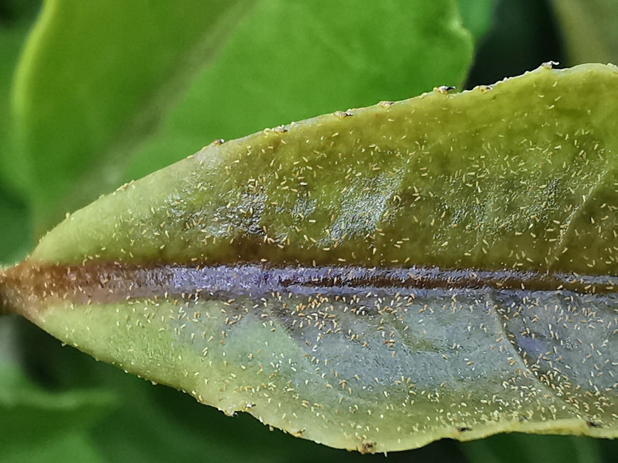 通过与茶农深入交流、实地调查和仔细观察后,认定茶树幼嫩芽叶枯萎主要是茶橙瘿螨和茶小绿叶蝉为害所致。服务团根据历年来对信阳茶园主要病虫害的监测数据和生态茶园建设的要求,建议尽快对茶树进行修剪,严禁喷施高毒低效化学农药。服务团还对茶树虫害部分进行取样,带回实验室开展室内研究。