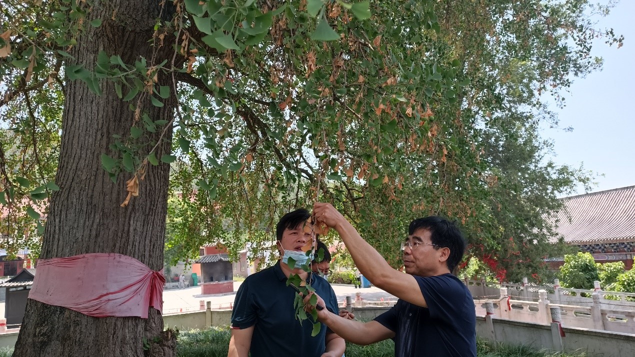 在返程的路上,服务团特地赶赴信阳贤隐寺,查看抖音上传的寺中1400多年树龄银杏树“生病”的原因。经与寺中负责人释明澈师傅了解、对银杏树被害状观察分析,确定是银杏超小卷叶蛾为害所致。随后服务团把该虫的发生规律和防治方法,以短信形式发给了释师傅。