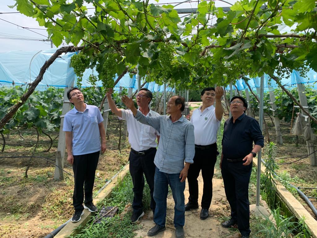 服务队一行实地查看了不同品种葡萄的生长及坐果情况,并就该时期的管理与企业负责人进行了交流。服务队认为,葡萄开花坐果后,会进入快速的果实膨大期。这个阶段的各项管理技术很关键,需要重点注意以下几个方面:一是控制好温湿度。最近高温天气,要做好葡萄气灼病的预防,特别是保持水分的供求平衡,同时注意预防病虫害的发生。二是葡萄果穗的管理。要做好疏粒和修穗工作塑造良好的串型结构,使整个果串更美观;合理留粒量,控制单穗重,避免超大穗带来的后期病虫为害和成熟度等管理风险。三是葡萄幼果膨大期的肥水管理。在葡萄幼果膨大期,建议在叶面喷施糖醇钙镁有机肥,配合土施磷钾肥,有效的补充果实膨大所需的营养元素,提高葡萄果皮的韧性减少裂果的发生。浇水方面,果实膨大期,需要保持有适宜的水分,避免因干旱导致的膨果受阻。