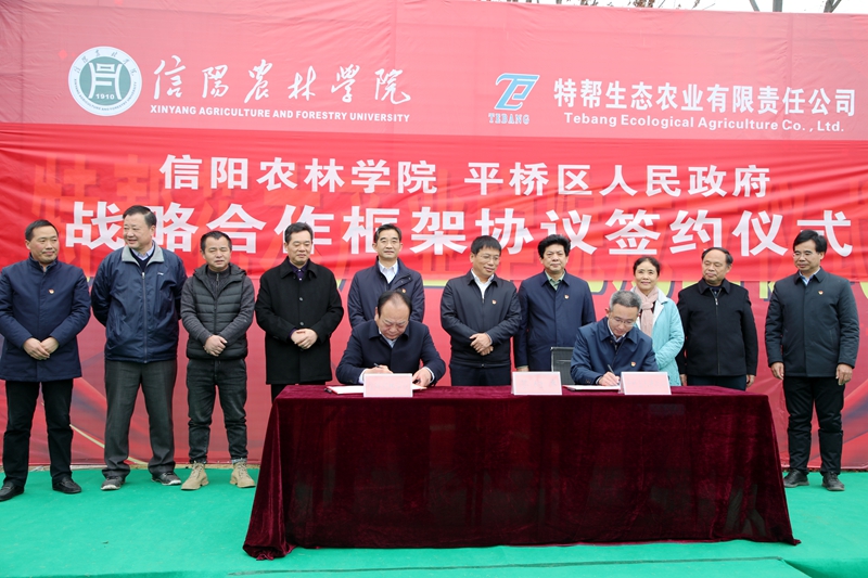 仪式伊始,邢勇代表学校和董立淳签订了校地战略合作框架协议,双方就战略合作目标、合作内容、合作机制、合作时间达成一致意见:未来五年,双方将在科技培养、技术支持、教育与人才培养、重大项目等方面深度合作,促进学校科研成果在平桥区转化,发挥学校科技与人才优势,为平桥区建设发展提供科技支持。邢勇还代表学校与特帮生态农业有限责任公司签订合作协议,明确了双方共建项目、建设任务、双方责任和义务、机构设置、合作时间等。科学技术(校地合作)处长史洪中、园艺学院党总支书记张祖成代表学校为特帮农业生态有限责任公司实践技能专家彭金祥、张强颁发聘书,聘任他们为花木产业学院首批指导专家。