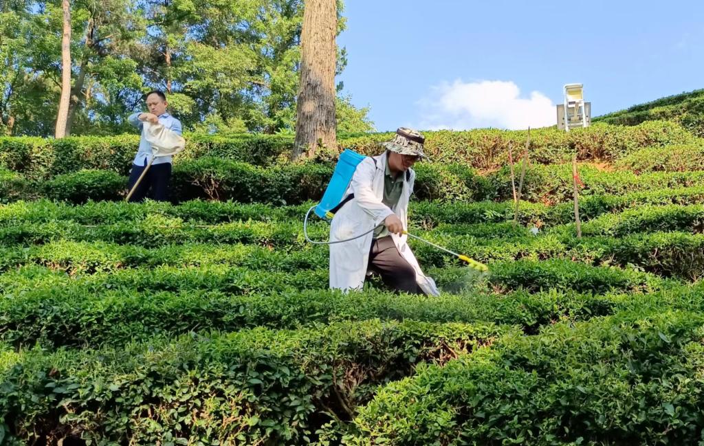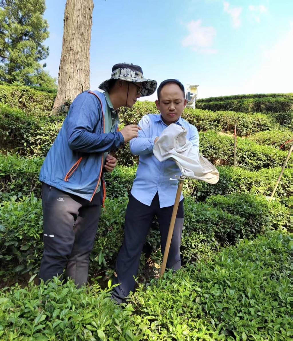 2022年6月30日,茶园病虫害监测预警与绿色防控科技服务团队与省农科院植保所开展茶园药效试验合作。省农科院植保所武予清研究员带领团队成员李慧玲、秦一凡和姬素婵老师与校茶园病虫害监测预警与绿色防控科技服务团队项目负责人乔利博士及团队成员张权老师一起,于浉河港镇夏家冲村茶园进行药效试验。