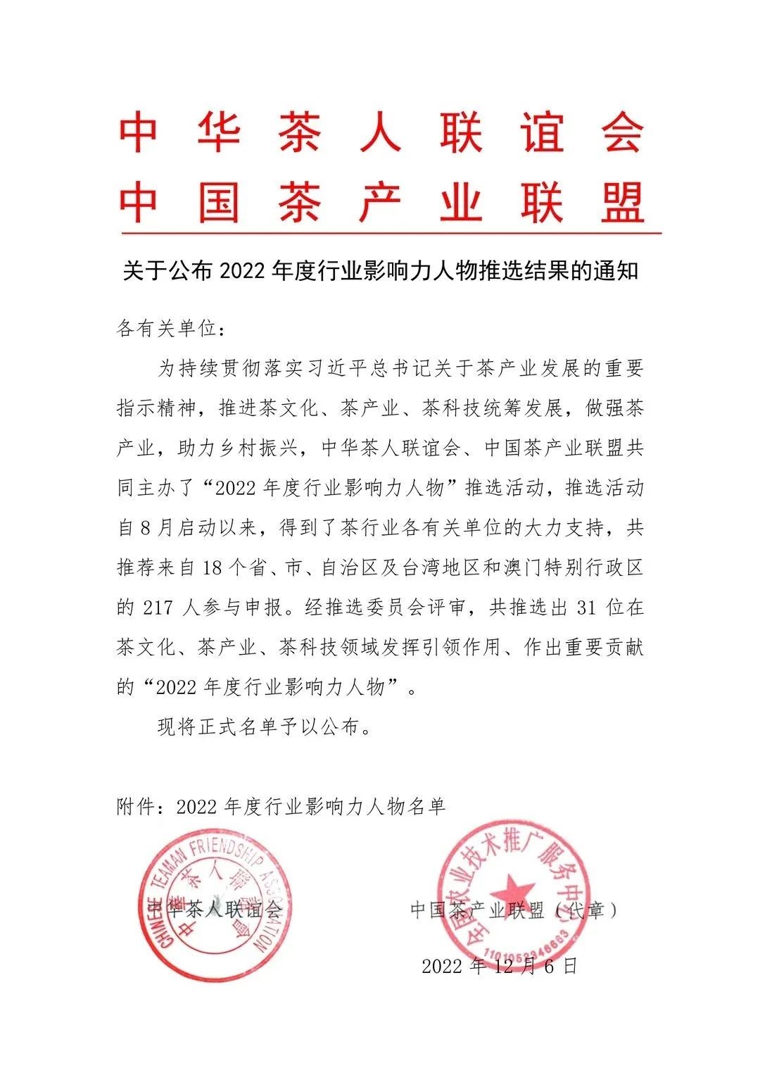 日前,中华茶人联谊会、中国茶产业联盟主办的“2022年度行业影响力人物推选活动结果正式公布。活动共推荐来自18个省、市、自治区及台湾地区和澳门特别行政区的217人,最终仅推选出31位在茶文化、茶产业、茶科技领域发挥引领作用、作出重要贡献的“2022年度行业影响力人物,beat365在线平台官网茶学院郭桂义教授入选,充分肯定了郭桂义教授40年来为茶文化、茶产业、茶科技的发展所做的贡献。