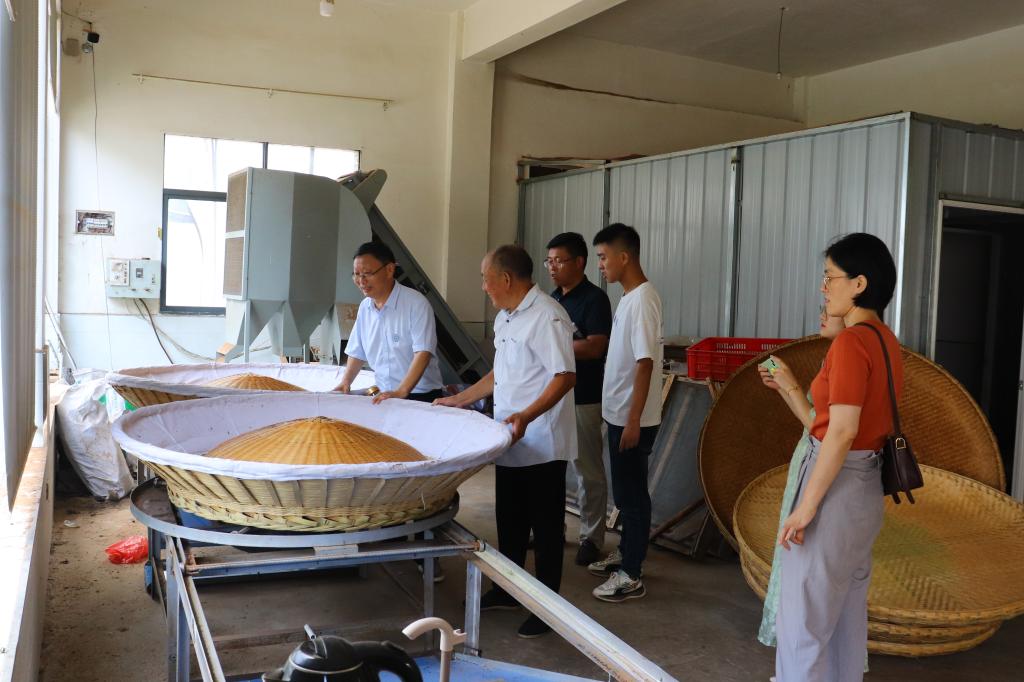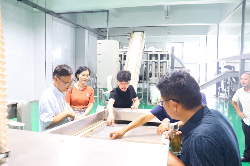 在其才茶业有限公司,服务团一行在负责人程其才的引导下先后实地考察了企业生产线并评审该公司今年春茶,随后前往茶园进行实地考察。郭桂义教授提出茶园距离生产线距离较远,鲜叶运输时间过长,导致茶叶有部分红变或偶有闷味,根据实地考察结果,郭教授提出可以利用山上现有的厂房建立简单初加工或者加强茶鲜叶保鲜运输从而避免茶鲜叶运输导致的品质问题。在河南九华山茶业有限公司,服务团在总经理朱超、厂长苏全宏带领下参观了全机械化生产线,参观过程中就信阳毛尖茶香气提升与信阳毛尖自动化加工技术的问题进行交流,郭教授肯定了机械化生产线中的一些改进,并现场讲解了每个环节的原理和作用,随后通过审评茶样对机械化生产提出了建设性意义,提出继续加强和完善茶叶机械标准化建设。去往河南五尖山茶业有限公司调研时,发现其在烘焙等过程借鉴六安瓜片的部分工艺,从而达到烘焙时省力省时,但考察其茶园时发现存在柳叶茶品种,即芽叶短小,发芽率极低,郭教授根据此现象提出茶树品种是决定茶叶质量水平的根本,优良茶树品种既有增高产量,增强抗逆性,也可改进茶叶品质。最后,服务团考察了河南仰天雪绿茶叶有限公司生产线及其50年树龄的茶树,郭桂义在考察茶园时提出夏季茶园管理的重要性,并结合不同茶树品种当前生长状态,对茶树育苗、栽培管理进行了技术指导。