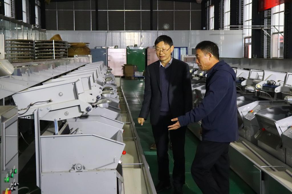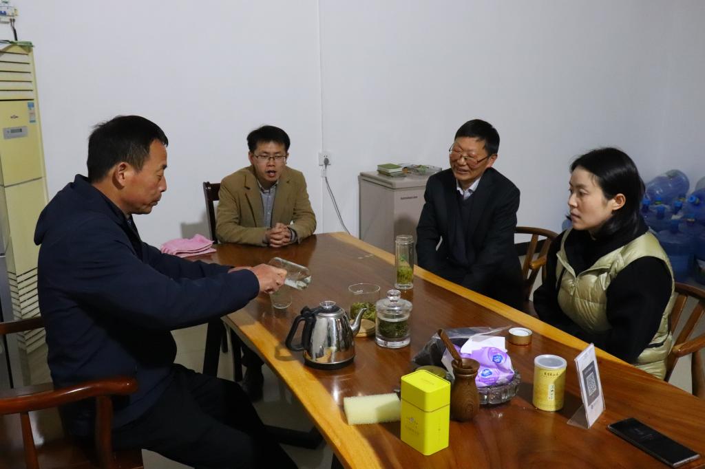 郭桂义教授从黄化茶引种到商城地区的生物适应性、黄金茶产品系列及其加工工艺角度与信阳市豫严生态农业发展有限公司负责人严总进行了深入交流,并参观了加工车间、生产线,进入茶园观察茶叶生长状况。
