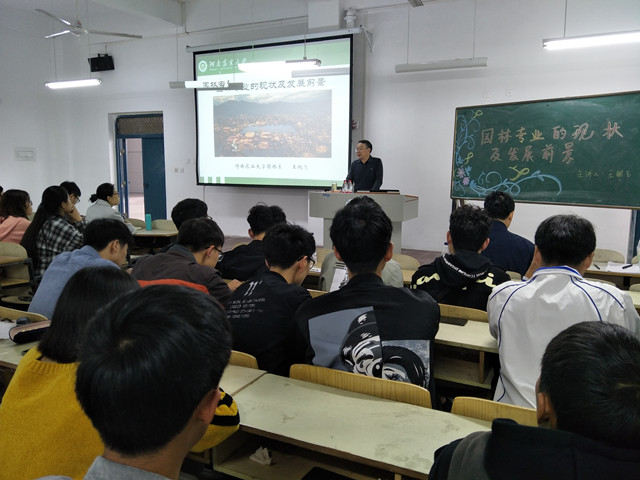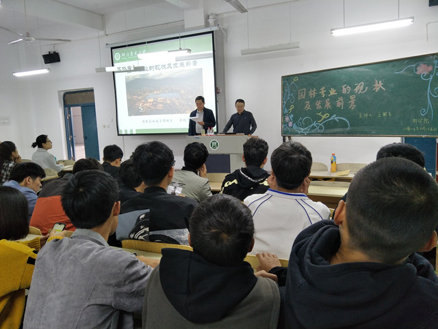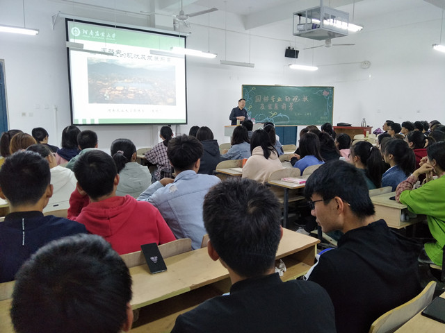 25日上午,河南农业大学园林系主任王鹏飞教授报告题目园林专业的现状及发展前景,林学院院长孙耀清教授主持,我院19146名园林专业学生和园林专业教师参加。王教授从事风景园林与城乡规划专业的教学与研究工作多年,获河南省科技进步二等奖5项,出版专著7部,发表专业论文80余篇,主持规划设计项目60余项,指导的研究生获第六届(2016艾景奖国际园林景观规划设计大赛金奖和2016“园冶杯大学生国际竞赛二等奖。王老师的报告从园林是什么、如何要建造人们满意的园林、园林专业的你将何去何从三个问题深入浅出阐述园林专业的专业思想,王教授的报告既富有理论性,又通俗易懂,师生们都受益匪浅。