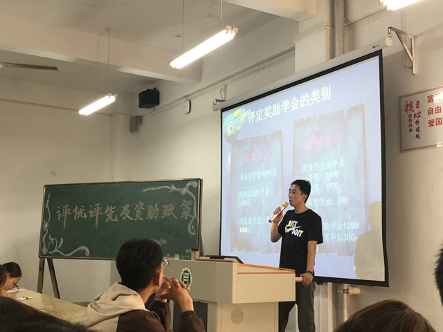 范阳阳老师首先对国家的各类资助政策的申请条件、所需材料及申请流程向同学们作了详细介绍,并指出申请助学金评定的同学要时刻注意自己的言行举止、消费以及学习情况。随后,范阳阳老师向同学们普及了奖学金评定、发放等问题。最后,在评优评先方面,范阳阳老师分别向同学们讲解了优秀学生干部、三好学生、模范团员、优秀团干部等评选办法以及国家助学贷款的分类、申请流程及注意事项。