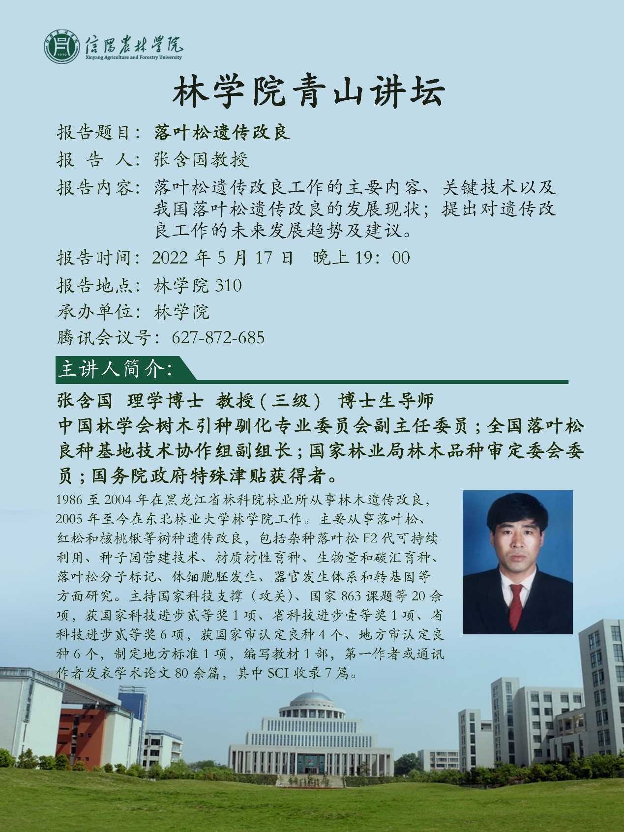 为了贯彻落实学校科研氛围营造年活动要求,按照林学院科研氛围营造年工作部署,学院邀请了中国林学会树木引种驯化专业委员会副主任委员、全国落叶松良种基地技术协作组副组长、国家林业和草原局林木品种审定委会委员、国务院政府特殊津贴获得者张含国教授到我院做青山讲坛学术报告,现将有关事宜通知如下:
