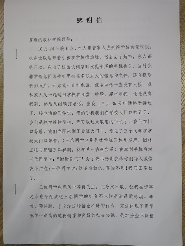 10月24日20时左右,李想、邓祥鹏、李宝泽三名同学外出办事返回学校途中,偶然在学校南门地面上发现一个手机,拾起后发现手机外观比较新,应该是购买不久,他们猜想此时失主一定很着急,于是就在原地等待失主返回来寻。没多久,失主打来电话,三位同学告诉失主他的手机在学校南大门口被拾到了,他们在校门口等着失主回来取。失主随后来到了学校大门口,联系上了拾到手机的三名同学(他们分别是林学院17级园林工程与管理专业专业的李想、邓祥鹏和17级林学专业的李宝泽),三名同学核实了失主身份后将手机归还给他,失主对三名同学再三感谢,并要给每位同学微信发红包,但被同学们婉言谢绝了。